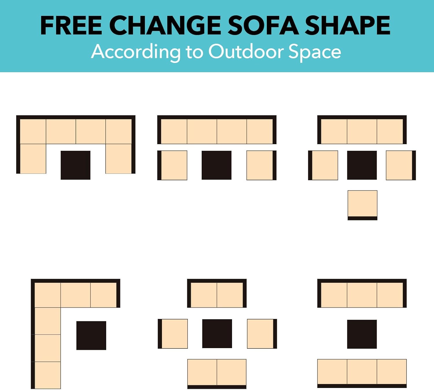 Flexible Combination:Patio set have many configuration options based on your preference and geography.Clips connect the sectional sofa,fastening strips and velcro tapes prevent cushions from sliding.L shape feet with adjustable screw adapt to variety of different terrains or adjust sofa height.